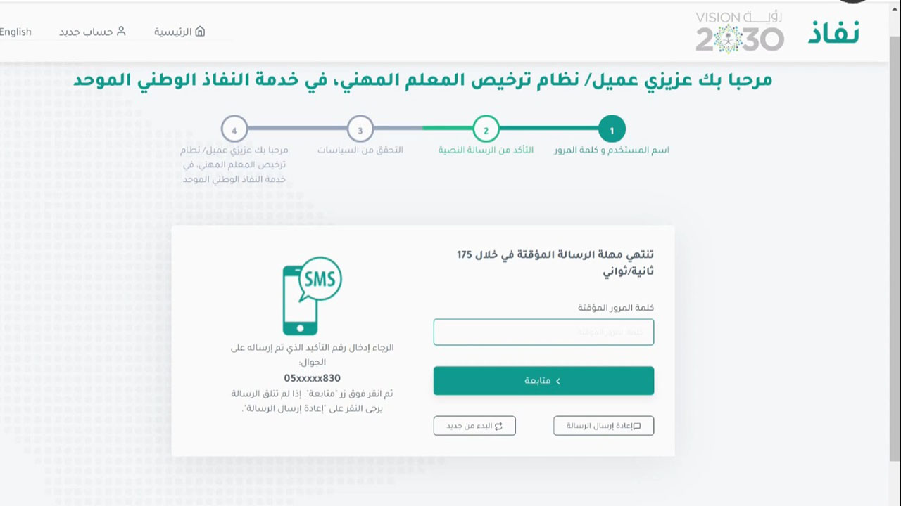 • يتم ادخال كلمة المرور المؤقتة والتي تصل في رسالة نصية عبر رقم الجوال المسجل في ابشر، قم بادخال رقم التأكيد الذي وصل عبر رسالة، وبعدها النقر على متابعة حتى يتم التحقق ويفتح حسابك على المنصة.